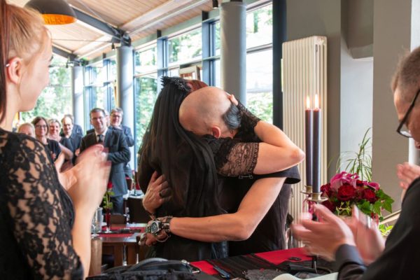 Wir sind uns sicher, dass nichts mehr zwischen uns kommen kann und wir gemeinsam alt werden wollen. Was ist ehrlicher, wenn nicht ein Versprechen ohne religöse oder staatliche Konventionen – rein aus Liebe füreinander? Und das wir wollten wir vor den für uns wichtigsten Menschen – unseren Familien und Freunden – bezeugen.