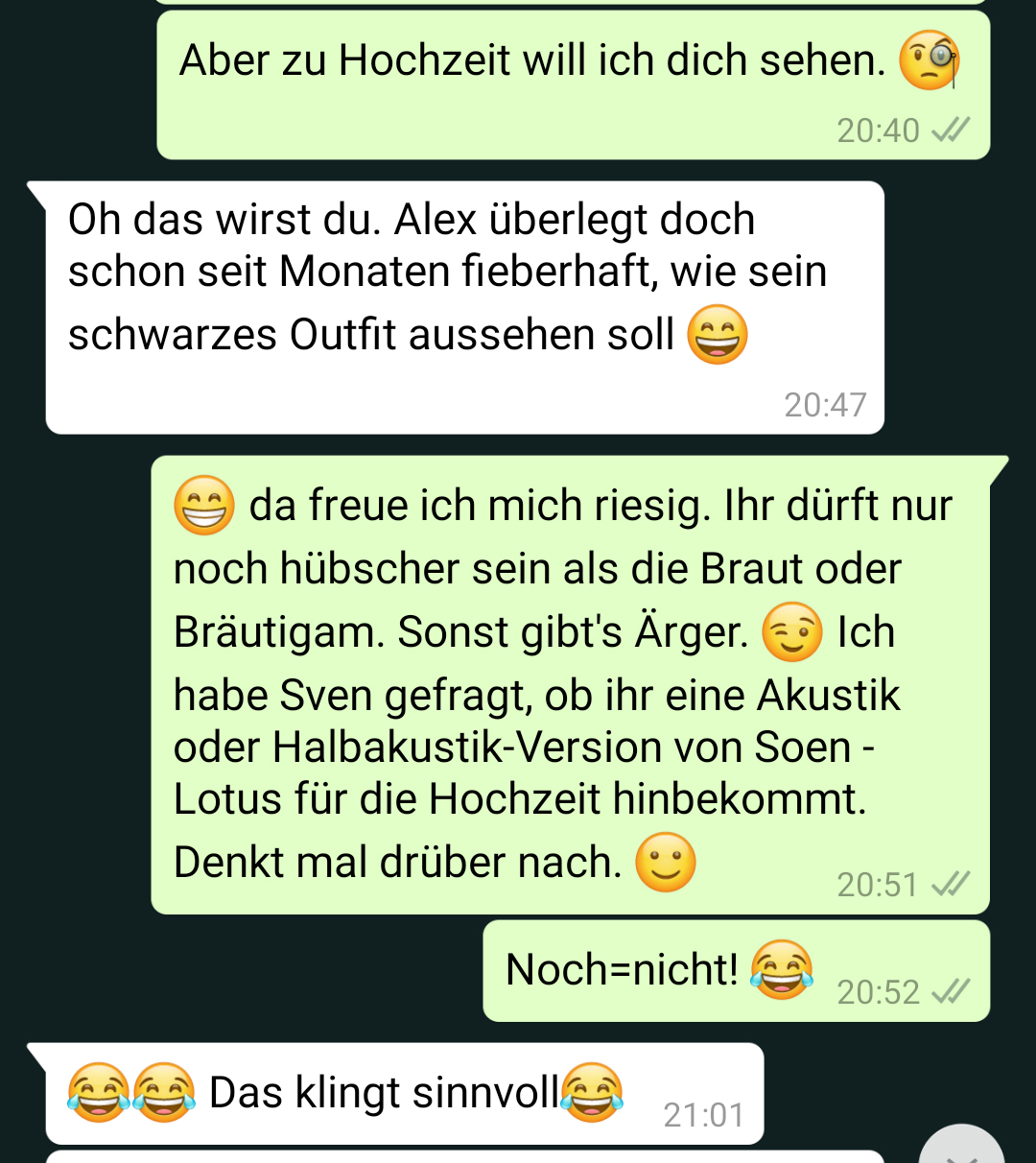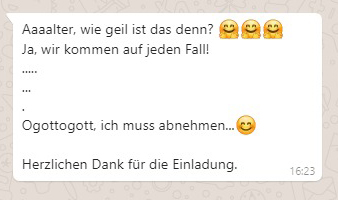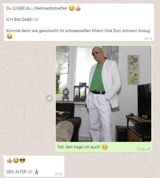 Dem Wob habe ich vorher erzählt, ich bräuchte seine Adresse, da wir per Post Einladungen für ein Weihnachtstreffen versenden wollen. Zum Glück hat er die Drohung mit dem weißen Anzug dann nicht umgesetzt.